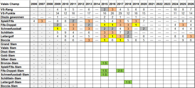 Spitzname Nation Beruf Verein Status Valais Champ Spiele 0 ×  1 ×  1 ×  Durchschnittsrang   (Gesamt) 5.92 Beste Klassierung 2 VS-Punkte (Gesamt) 230 Max. VS-Punkte               (pro Turnier) 34 Teilnahmen 13 Anzahl Einzeltitel 7 Disziplinen gewonnen Leitergolf 1  ×  1  ×  3  ×  Fifa-Doppel 3  ×  2  ×  4  ×  Schneefussball 1  ×  3  ×  3  ×  Fifa / Spieli 0  ×  1  ×  4  ×  Boccia 2  ×  0  ×  1  ×  Schlitteln 0  ×  1  ×  2  ×  Anzahl Slams Anzahl Medullien Slam 4 von 12 17 von 21 Schweiz Schlafen Karriere POM POM aktiv Medullienspiegel Einzeltitel 4 von 6 Medullienspiegel Lättinho Lattmann, die Ratte