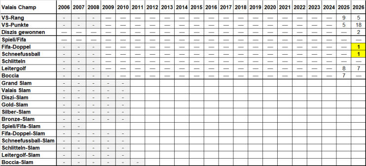 Spitzname Nation Beruf Verein Status Valais Champ Spiele 0 ×  0 ×  0 ×  Durchschnittsrang   (Gesamt) 7.00 Beste Klassierung 5 VS-Punkte (Gesamt) 23 Max. VS-Punkte               (pro Turnier) 18 Teilnahmen 2 Anzahl Einzeltitel 2 Disziplinen gewonnen Leitergolf 0  ×  0  ×  0  ×  Fifa-Doppel 1  ×  0  ×  0  ×  Schneefussball 1  ×  0  ×  0  ×  Fifa / Spieli 0  ×  0  ×  0  ×  Boccia 0  ×  0  ×  0  ×  Schlitteln 0  ×  0  ×  0  ×  Anzahl Slams Anzahl Medullien 2 Slam 0 von 12 2 von 21 Medullienspiegel Martin Jagr Tschechien - Karriere - teil-aktiv Medullienspiegel Einzeltitel von 6