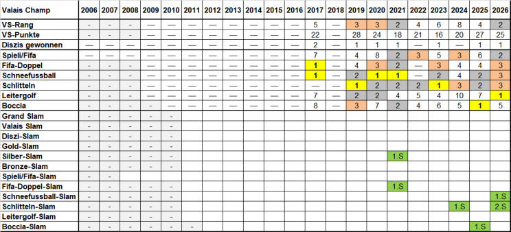 Spitzname Nation Beruf Verein Status Valais Champ Spiele 0 ×  2 ×  2 ×  Durchschnittsrang   (Gesamt) 4.11 Beste Klassierung 2 VS-Punkte (Gesamt) 201 Max. VS-Punkte               (pro Turnier) 28 Teilnahmen 9 Anzahl Einzeltitel 8 Disziplinen gewonnen Leitergolf 1  ×  2  ×  0  ×  Fifa-Doppel 1  ×  1  ×  3  ×  Schneefussball 3  ×  3  ×  1  ×  Fifa / Spieli 0  ×  2  ×  2  ×  Boccia 1  ×  1  ×  1  ×  Schlitteln 2  ×  4  ×  2  ×  Anzahl Slams Anzahl Medullien 5 von 6 Slam 5 von 12 18 von 21 Medullienspiegel Einzeltitel Naruto SadiL Türkei Knipser Karriere POM POM aktiv Medullienspiegel